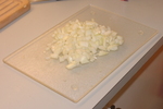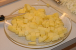Nakrájame zemiaky tak, aby kocky boli menšie ako cestoviny. Tým dosiahneme, že zemiaky a cestoviny budú rovnako dobre uvarené.