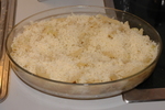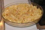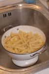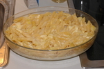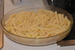Uvarené zemiaky s cestovinou zlejeme a dáme do nádoby vhodnej na zapekanie.