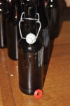 | Flaše som najprv dva krát premyl a dal ich do vane plnej horúcej vody. Odstránil som im červené gumičky na uzáveroch, ktoré som poriadne vydrhol kefou v horúcej vode. Nie všetky sa dali uvolniť, pravdepodobne to závisí od výrobcu flaše. Po piatich minútach sa nálepky z fliaš sami odlepili a mohol som flaše kefkou ešte raz poriadne vydrhnúť z vnútra aj z vonku. Prezrel som dno každej flaše, kde nesmú zostať žiadne usadeniny.