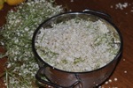 Peľ z kvetov sme priamo pri zbere otriasli, lebo nie je pre výslednú chuť podstatný a baza bez peľu má výhody: neurobí v kuchyni taký veľký neporiadok a vo flaši neostáva jemná žltkavá stopa.