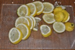 | Citróny poriadne umyjeme, nakrájame na plátky, pridáme ich do sirupu a pomiešame. Konce citrónov vyhadzujeme.