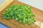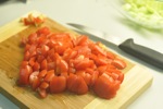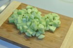 | Uhorku ošúpeme a nakrájame na kocky. Paradajky rozkrojíme, vyrežeme zbytky stopiek a nakrájame ich tiež na kocky.