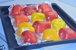 | Papriky rozkrojíme na polky, vyčistíme a vnútornou stranou uložíme na plech na pečenie, na ktorom je položený alobal (tenká hliníková fólia na pečenie). Plech s paprikami vložíme do rúry vyhriatej na 220 °C a necháme ich tam 20 minút piecť.