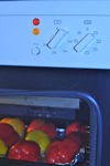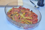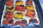 | Skontrolujeme papriky - sú hotové ak vyzerajú ako na obrázku - trochu spečené a majú "pľuzgiere" - oddelenú kožu od mäsa papriky. Vyberieme ich a necháme 20 minút vychladiť (budú sa nám ľahšie šúpať - nepopálime sa).